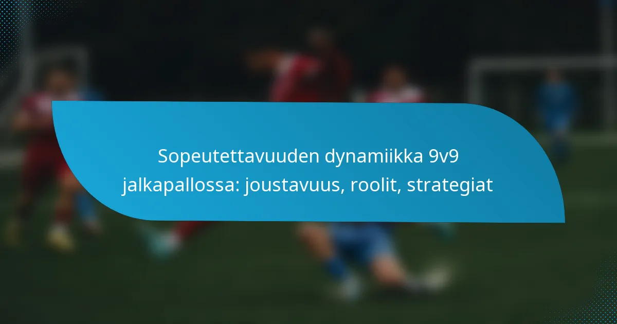Sopeutuminen 9v9-jalkapallossa on olennaista joukkueen menestykselle, sillä se kattaa kyvyn muuttaa strategioita, rooleja ja taktiikoita pelin kehittyvien dynamiikkojen mukaan. Tämä joustavuus ei ainoastaan optimoi suorituskykyä, vaan myös mahdollistaa pelaajien roolien siirtämisen yksilöllisten vahvuuksien ja pelin kulun mukaan. Käyttämällä sopeutettavia strategioita ja edistämällä tehokasta viestintää joukkueet voivat parantaa reagointikykyään vastustajiin ja erilaisiin pelitilanteisiin.
